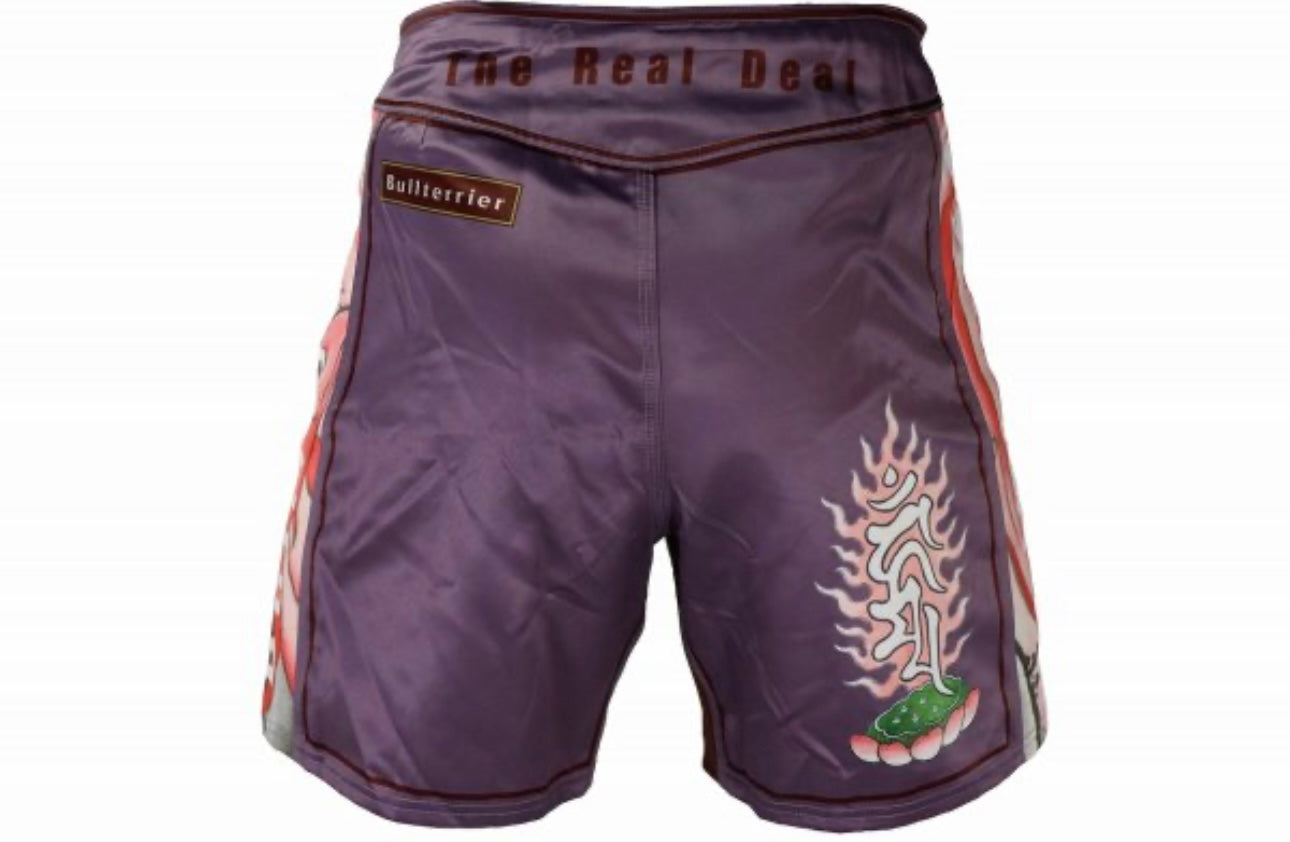 Fight shorts modeled after the popular "Mushin" series, featuring the Bull Terrier "Acala."